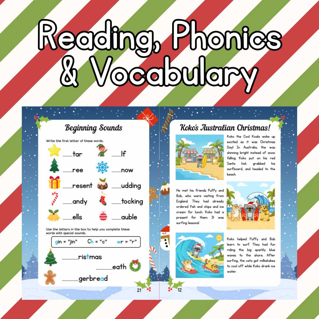 • Global Awareness: In "Koko’s Australian Christmas," children read a comprehension story about a koala surfing on the beach, teaching them how Christmas looks in different parts of the world.