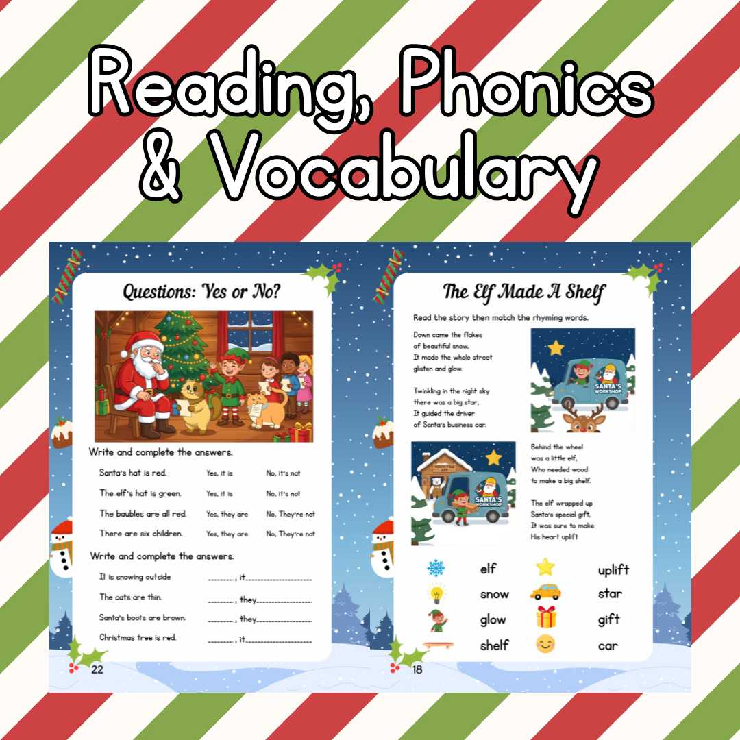 • Reading Comprehension: "Questions: Yes or No?" tests understanding by asking children to look at a scene of Santa and the cats and answer questions like "Santa's hat is red" or "The cats are thin".
